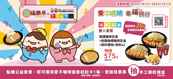 自 2025 年 10 月 27 日起至 2025 年 12 月 15 日止,福勝亭攜手唐氏症基金會推動「愛不囉嗦,幸福同行」公益活動。活動期間於全台福勝亭門市推出「福氣滿唐 雙人套餐」,每售出一套公益套餐,福勝亭即隨餐捐贈新台幣 20 元予唐氏症基金會,支持其就業培訓與早期療育服務,讓消費者的味蕾享受轉化為溫暖的社會助力。